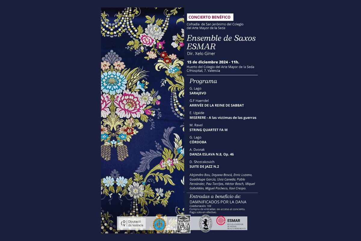 Prepárate para disfrutar del talento del Ensemble de Saxos ESMAR, bajo la dirección de Xelo Giner, con un programa de aúpa y en un entorno lleno de historia que ofrece el Huerto del Colegio del Arte Mayor de la Seda.