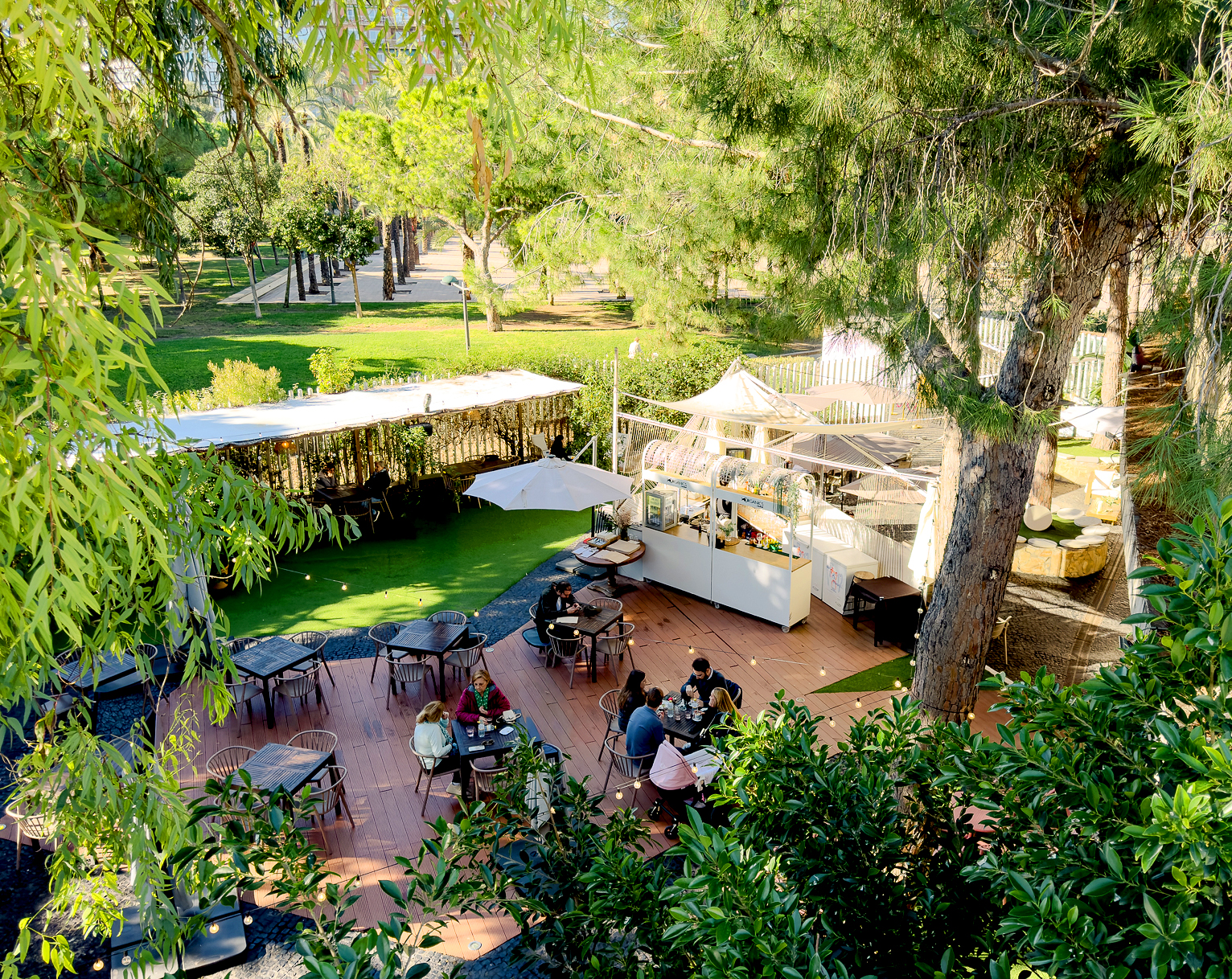 Jardines del Palau, restaurant en terras midden in de Jardín del Turia. Jardines del Palau is de perfecte plek om even uit te rusten als je de Jardín del Turia komt bezoeken. Een restaurant en terras verscholen tussen de bomen, recht tegenover het Palau de la Música, waar je kunt stoppen om de lokale smaken te proeven en daarna je route kunt vervolgen door een van de mooiste stadsparken van Europa. Als je Valencia bezoekt en zin hebt om de oude rivierbedding te verkennen, al wandelend, op de fiets of genietend van de sfeer aan de rivier, dan is dit een goede tussenstop. Ontbijt met knapperig brood en versgezette koffie, een authentieke “esmorzaret” in de zon en een dagmenu met Valenciaanse rijstgerechten vanaf € 13,50, bereid met lokale producten. Droog, zoet... u kiest. En als uw wandeling wat langer duurt, hebben we ook cocktails met dat mediterrane tintje. U vindt ons midden in de oase van de Turia. Ideaal als u de lokale gastronomie wilt ontdekken zonder de meest emblematische natuurlijke omgeving van de stad te verlaten. Als u uw bezoek aan het plannen bent, raden we u aan om van tevoren te reserveren, vooral op feestdagen.