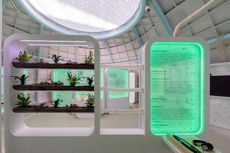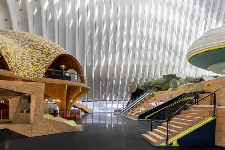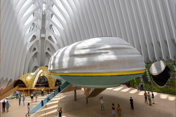 El CaixaForum València es un proyecto singular consagrado a la difusión del conocimiento y la cultura, que aúna historia, arte, ciencia y tecnología al servicio de la divulgación. Se ubica en el singular edificio del Ágora, obra de Santiago Calatrava, en plena Ciutat de les Arts i les Ciències. El arquitecto Enric Ruiz-Geli y su estudio Cloud 9, ha concebido el espacio expositivo como un organismo vivo, a través de un restaurante que es un jardín de plantas aromáticas, unas oficinas que se elevan en forma de palmera, un aula educativa que es una nube que flota en el espacio y un auditorio que es un bosque invertido. Y todo ello, rodeado de agua y conformando un lago. Dos esculturas dotan de identidad local el conjunto. “Arc al cel”, de Inma Femenía, reproduce el fenómeno óptico del arcoíris mediante la luz solar y representa la combinación de arte, naturaleza, ciencia y arquitectura, esencia del museo. La otra es Palafit, de Anna Talens, un palafito de sección triangular y dorado, pensado para recordar y sacralizar el modo de vida de los agricultores de l’Albufera